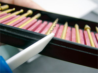- 最适合以前困難的、含有玻璃、碳纤维、滑石粉等硬質塑料成型品的去除毛刺的工作。另外、铝?黄铜、銅等非鉄金属的去毛刺、倒角加工也很适合。