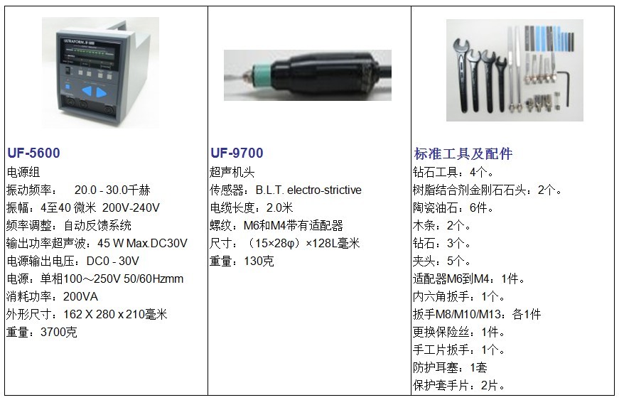 功率增加50%,比以前的ULTRAFORM机型。 新电路提供恒定的功率,无论施加压力机头。 多种选择从4冲程 - 40微米使操作速度更快,超高精加工。 新扩大的工装范围,包括陶瓷油石和树脂结合剂金刚石工具。 新的轻量级通用机头能够对ARGOFILE全系列电动手持机工具提供动能,从最小到最大的。 UF-5600提升了30%的扭矩,支持ARGOFILE AF(LA051等)系列电动手持机。 新的工具制造标准提升了超声波工具的工作状态。